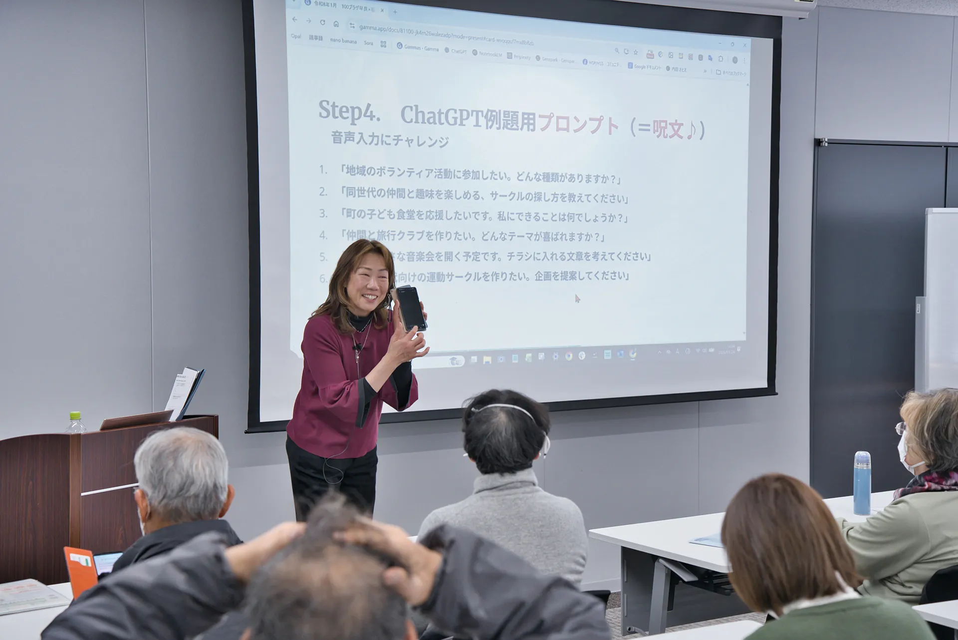 「地域ボランティア活動に参加したい。どんな種類がありますか?」「同世代の仲間と趣味を楽しめるサークルの探し方を教えてください」といったプロンプトを入力。AIから返ってくる具体的で多種多様な提案に、会場のあちこちで驚きと喜びの声が上がりました。